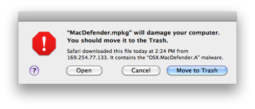 Update 2011-05-31: I wanted to clarify a point, now that Apple has updated Mac OS X to show this dialog for Mac Defender: